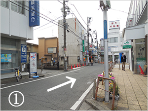 写真①は長津田駅南口にあるロータリーで、「JA田奈長津田」と「横浜銀行」の間の道となります。