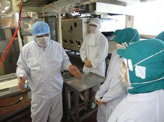 製造エリアの衛生チェックは厳重で、白衣・頭巾・マスク・白長靴に着替え、白衣の上からコロコロローラーで毛や埃を完全除去。そのあとドアで密閉されたエアカーテン室で埃を完全に落とし、やっと工場ゾーンへ。