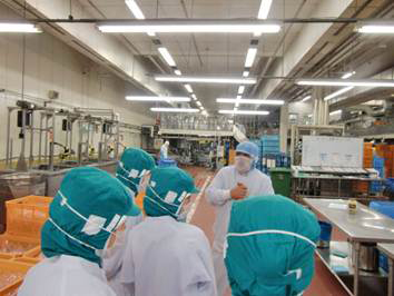 最初はお菓子製造ライン。抹茶ロールケーキの製造現場だ。抹茶味のスポンジの上に小豆や生クリームを乗せてクルッと巻き上げ、1人前にカットしたケーキ。そこで実際にラインの中で製造の手作業を手伝わせてもらった。緊張の場面を皆何とか器用にこなし、出来上がったケーキはそのまま出荷されていった!