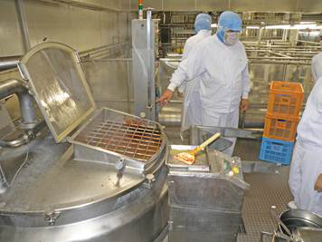 最後にセントラルキッチンの見学。ロイヤルホストの料理はここで調理・味付けをして小口に分けられて全国の店舗に運ばれる。店舗のキッチンでは最後の調理をしてお客さんに出される。この方法だセントラルキッチンの中は広大で清潔。調理場では超巨大なフライパンや鍋(カレーで言うと2トン分!)がずらり。しかも味の最終チェックでダメだと、せっかく作った料理全部を捨てなくてはいけないので、鍋の前の担当者は真剣に作業していた。お店での調理を簡単にするし、何より「昧のばらつき」が出ない。